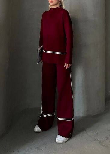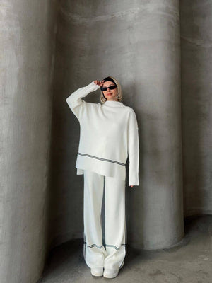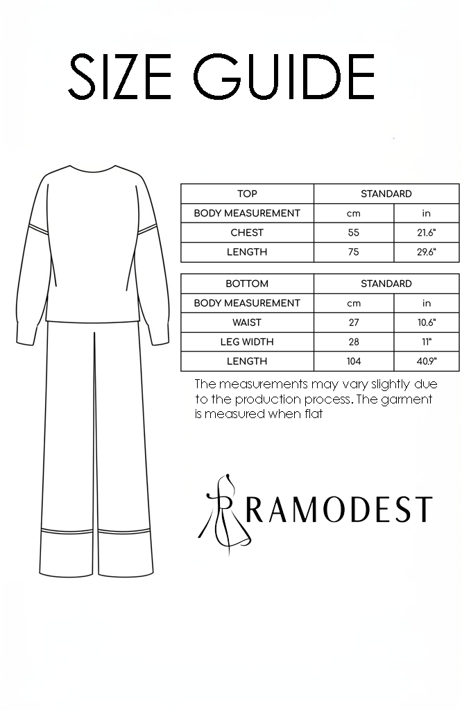 Step into effortless elegance with the KENZA modest clothing set from Ramodest Canada / USA. This two-piece co-ord features a relaxed-fit tunic with subtle black line details and matching wide-leg pants, offering a modern yet modest silhouette.