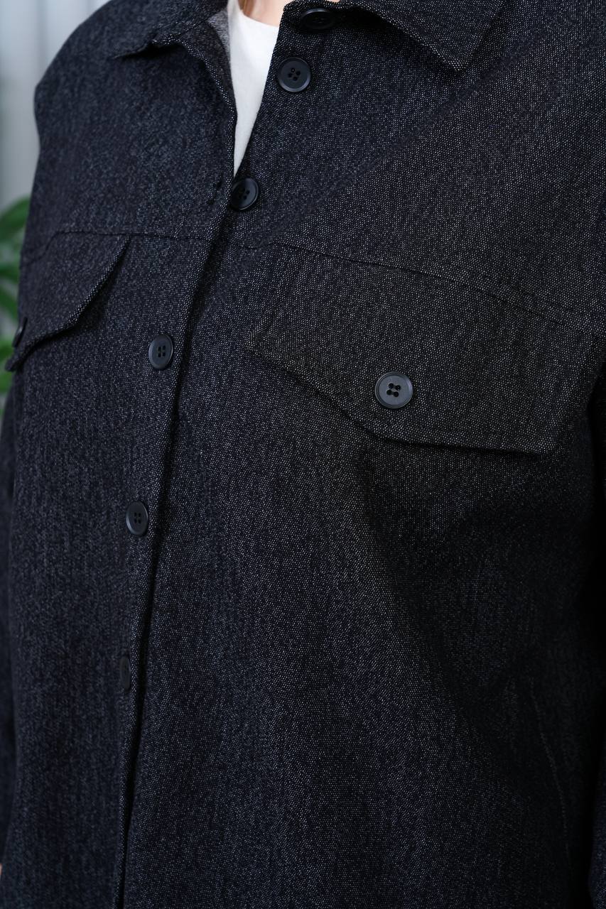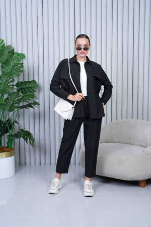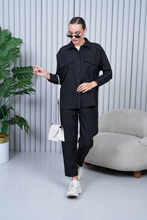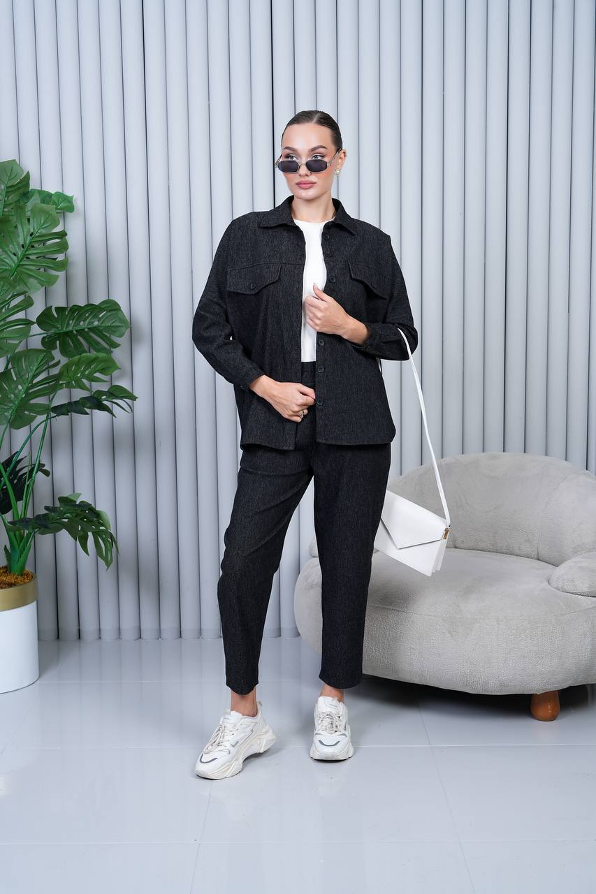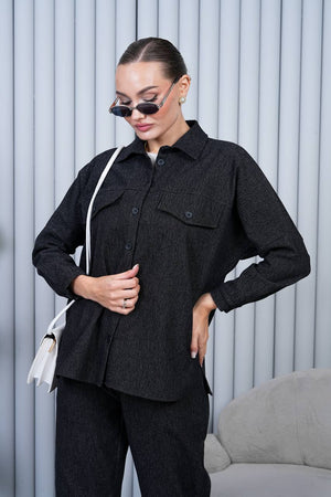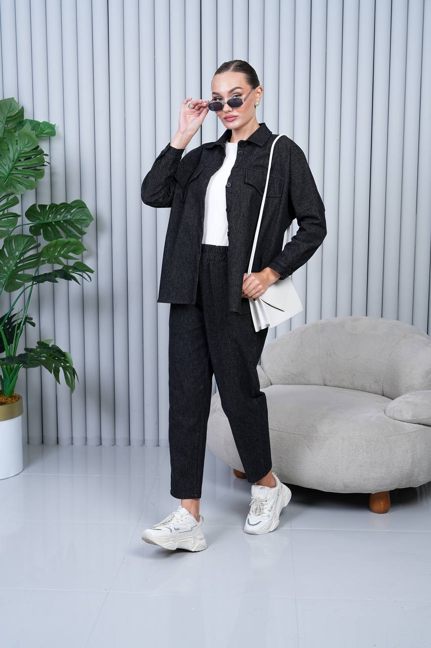 Relaxed-fit co-ord set made of a soft cotton-blend fabric with a denim effect. Features a button-up long-sleeve overshirt with flap chest pockets and a classic collar. Matching high-rise trousers with an elastic waistband for comfort and a straight-leg fit. Perfect for casual-chic styling, pairing effortlessly with sneakers or boots.