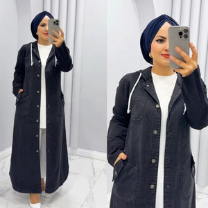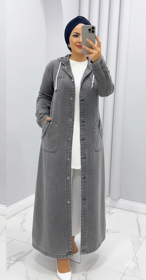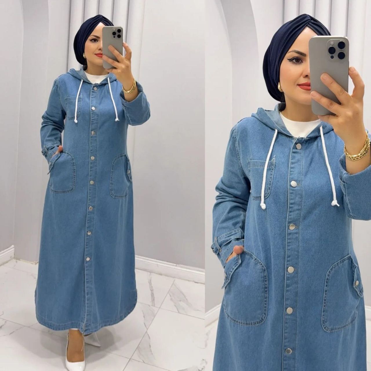 Stay stylish and comfortable with the RAMA denim dress from Ramodest Canada / USA. Designed for modern women who love modest clothing, this full-length button-down dress features a classic hood, front pockets, and a relaxed fit for everyday elegance.