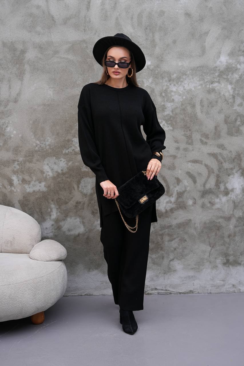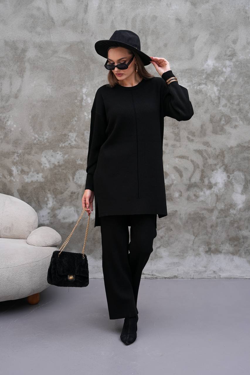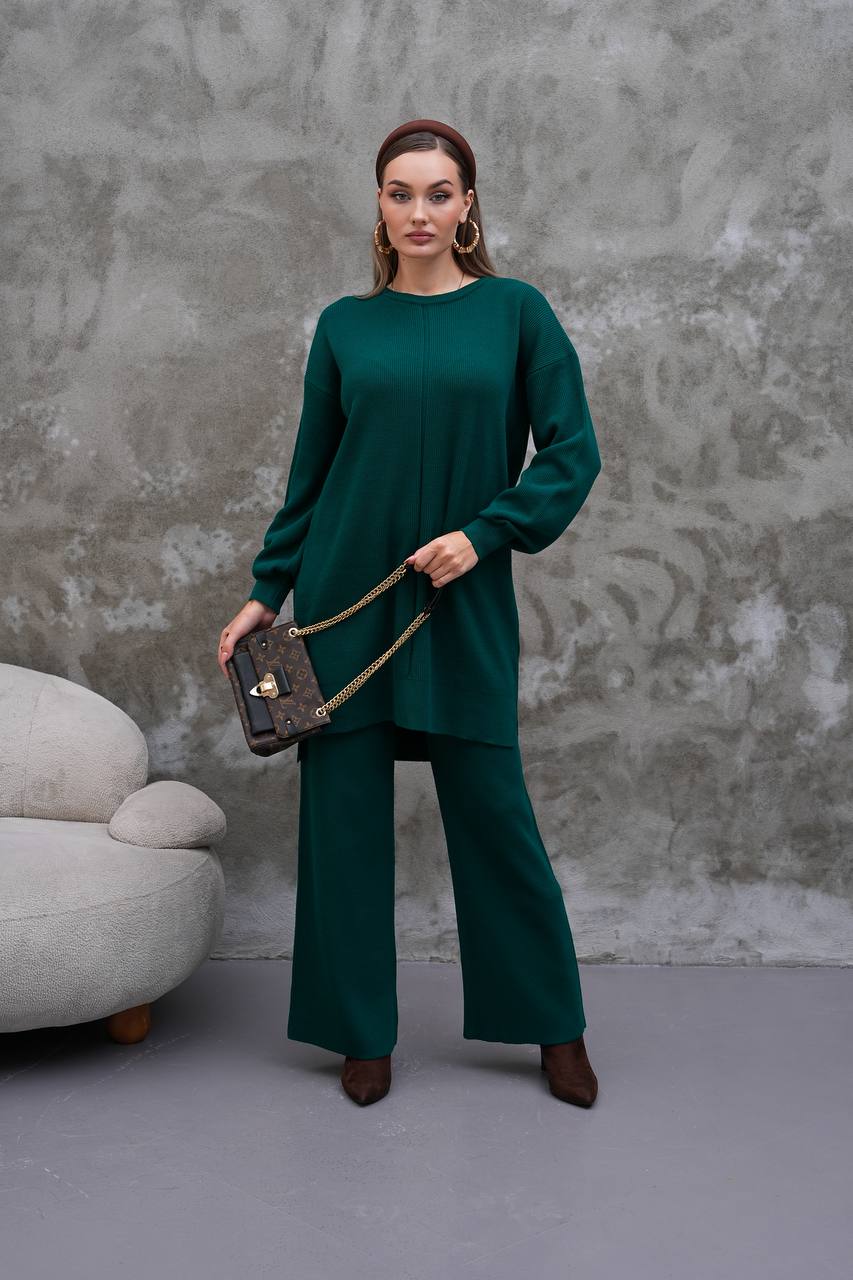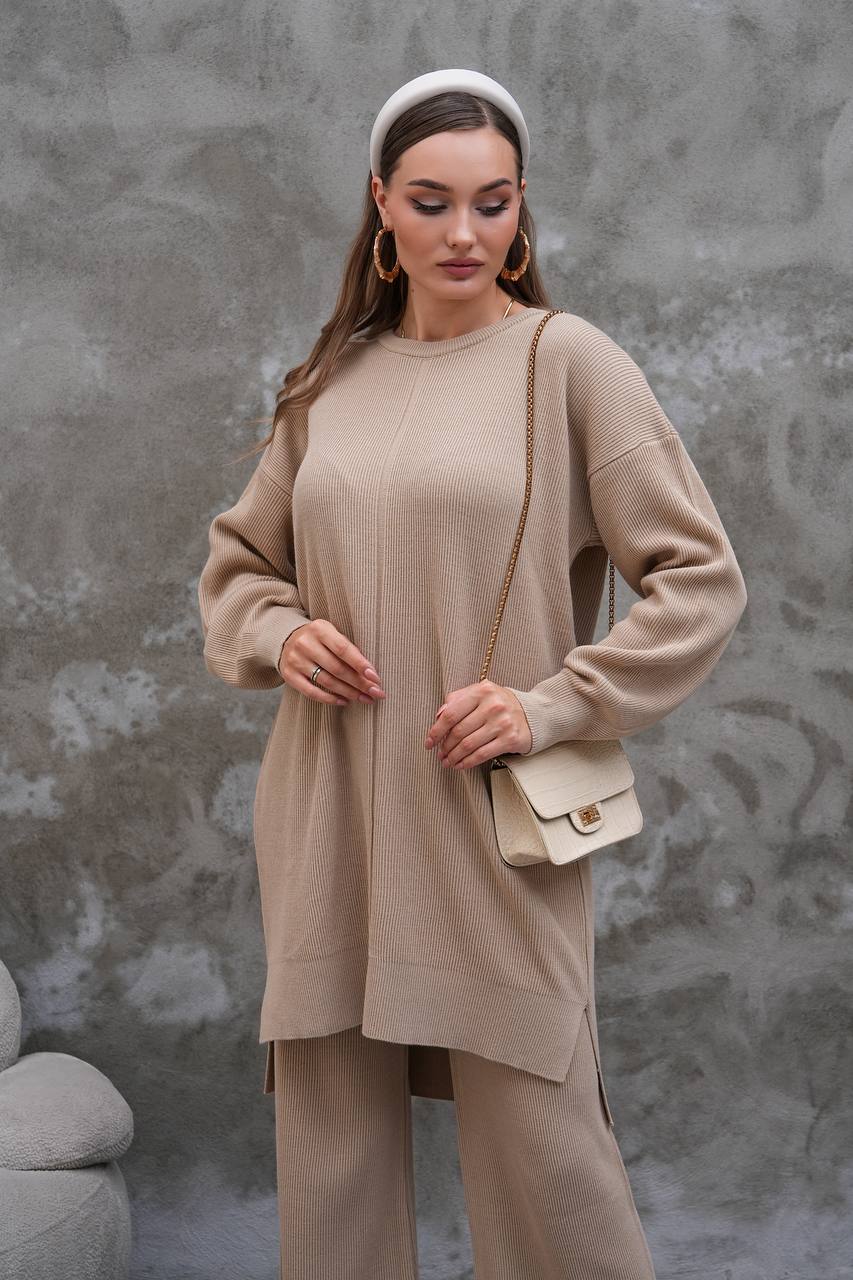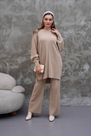 Elevate your modest wardrobe with this elegant two-piece knit set from Ramodest. Designed for modern women who value both comfort and style, this outfit features a long tunic with side slits and wide-leg pants for a relaxed yet chic look. Perfect for hijab fashion, daily wear, or special outings, it blends modesty with timeless elegance.