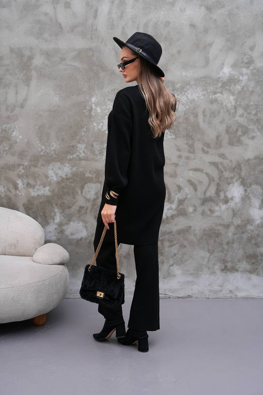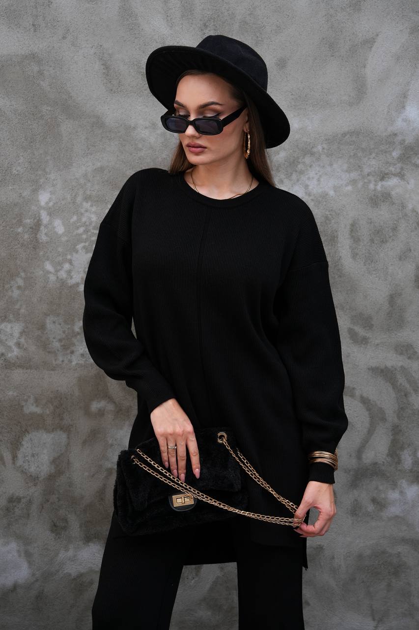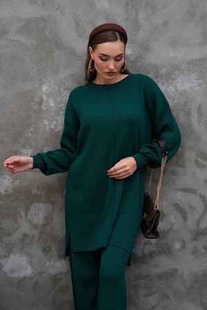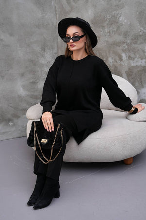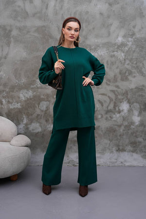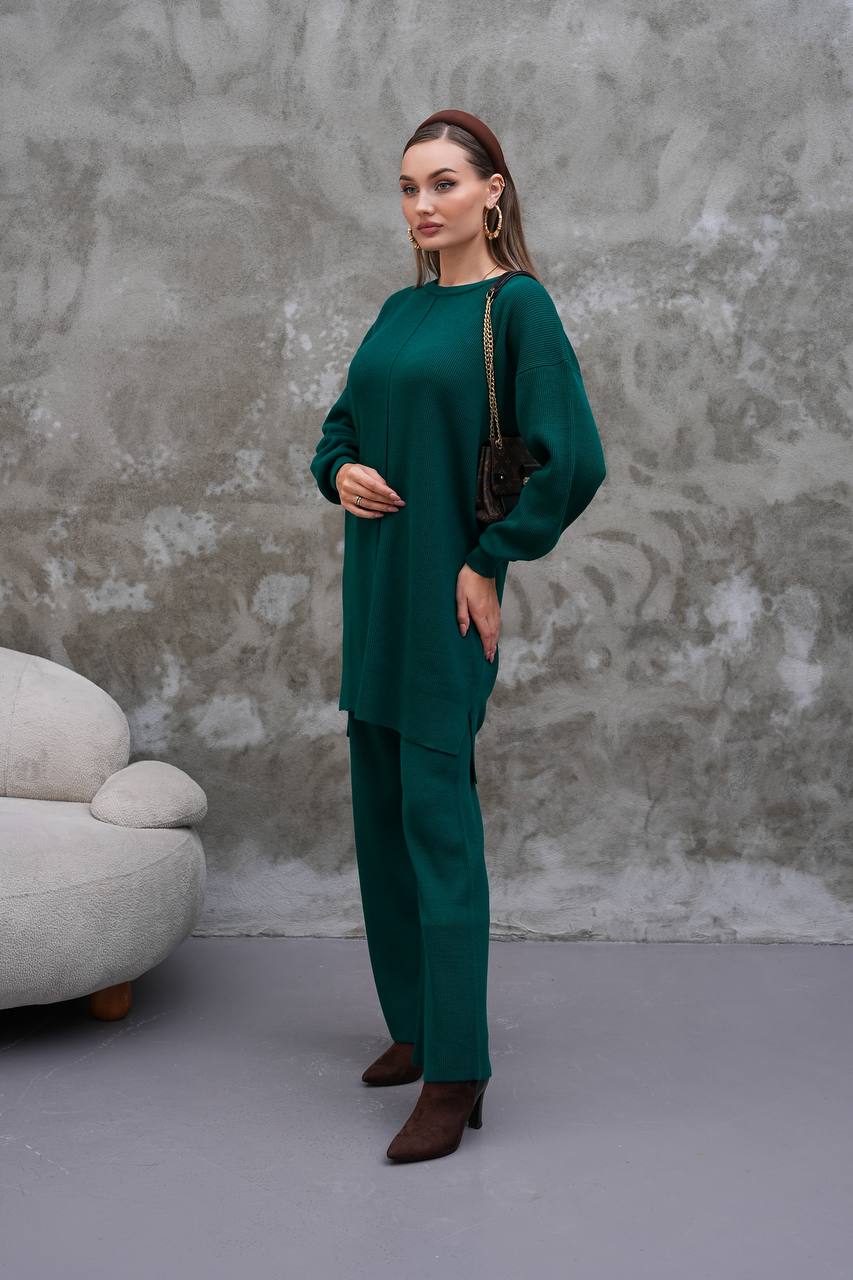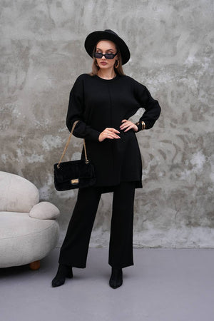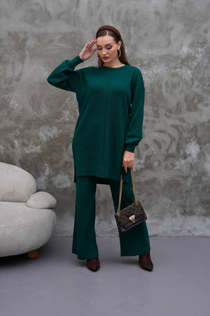 Elevate your modest wardrobe with this elegant two-piece knit set from Ramodest. Designed for modern women who value both comfort and style, this outfit features a long tunic with side slits and wide-leg pants for a relaxed yet chic look. Perfect for hijab fashion, daily wear, or special outings, it blends modesty with timeless elegance.